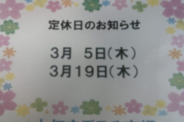 「定休日のお知らせ」2月5日は第一木曜日のため定休日とさせていただきます。