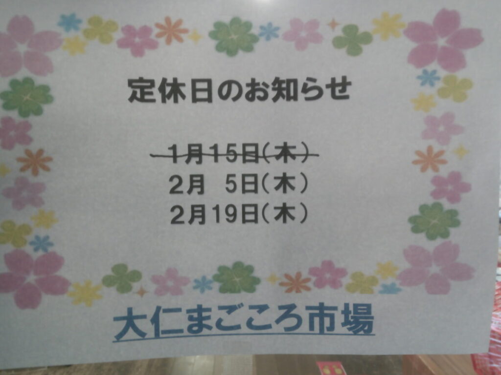 「定休日のお知らせ」2月5日は第一木曜日のため定休日とさせていただきます。